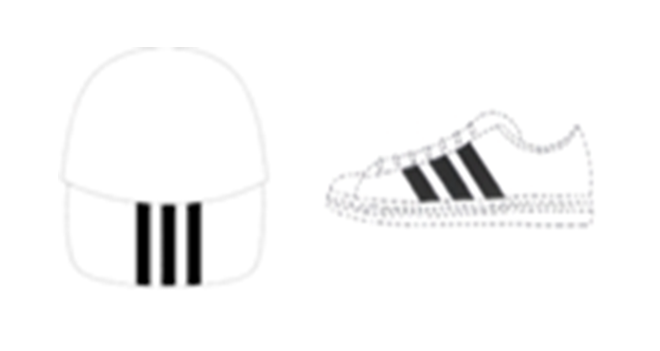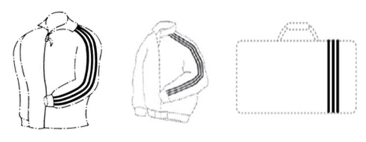 “Nhãn hiệu bao gồm ba sọc cách đều nhau, cùng màu, được dán ở mặt ngoài của hàng hóa thuộc phạm vi mô tả, các sọc chạy dọc gần như toàn bộ chiều dài của bề mặt bên ngoài của tay áo, ống quần và/hoặc thân quần của hàng hóa, các sọc này tương phản với màu của phần hàng hóa mà các sọc được dán, như minh họa trên đơn đăng ký”. Mô tả của hai trong số các nhãn hiệu này cũng đề cập đến hình minh họa phía dưới.