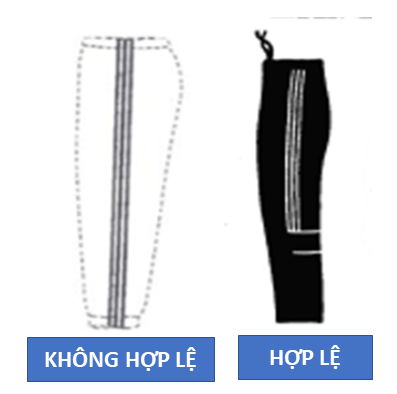 Ngược lại, nhãn hiệu quần thể thao (tối màu) được hiển thị bên phải là hợp lệ vì mô tả và hình minh họa được xác định là đủ rõ ràng và không chỉ ra rằng các sọc có thể có độ dài hoặc vị trí khác nhau.